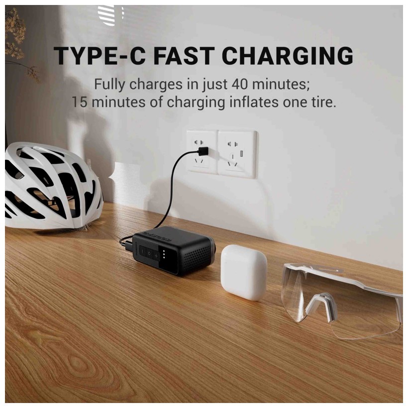 Con una potencia de trabajo de 70 W y una velocidad de inflado de 17 L/min, la AP-X1 es capaz de inflar ruedas de bicicleta de carretera, MTB, gravel o eBike de forma rápida y eficiente. Su rango de inflado de 3 a 120 PSI cubre prácticamente cualquier necesidad, desde ajustes finos de presión hasta inflados completos.