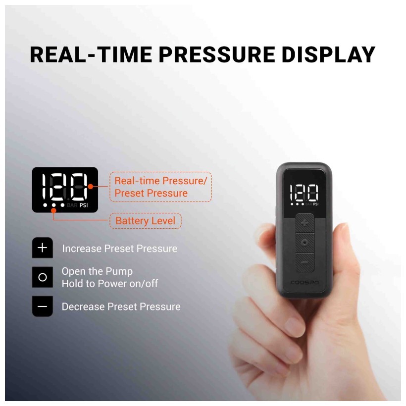 La pantalla digital de 17 × 13 mm permite visualizar la presión en tiempo real, garantizando un inflado preciso y seguro en cada uso.