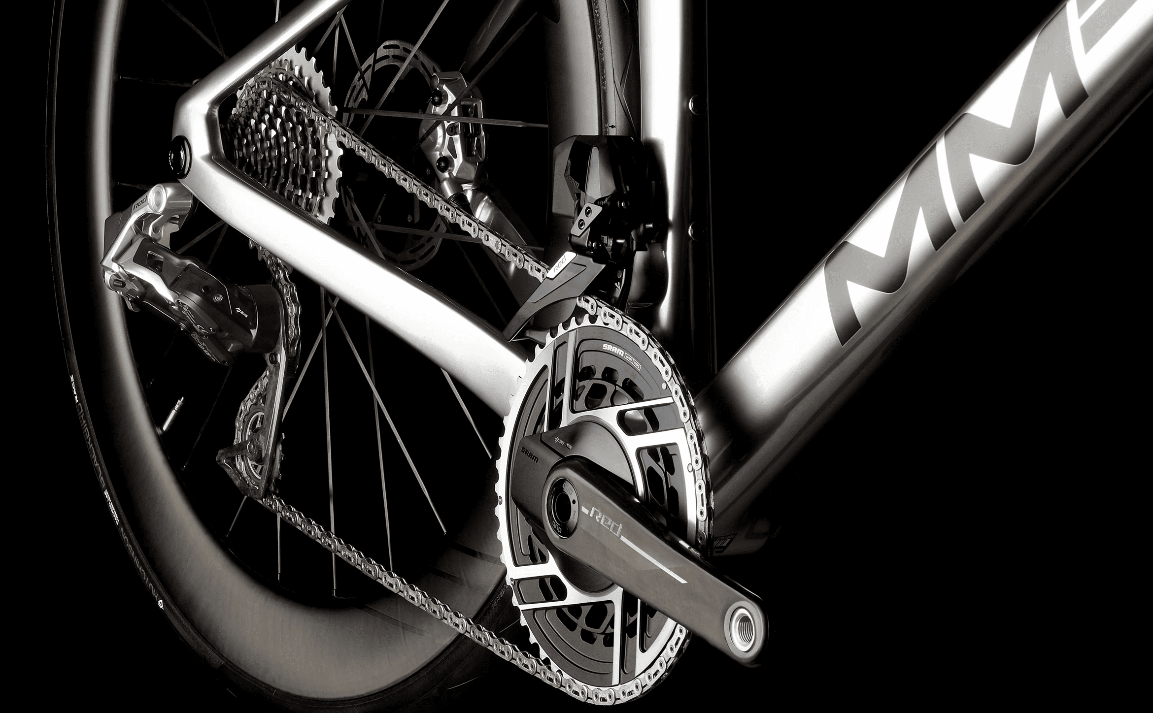 A bicicleta monta o grupo SRAM RED AXS, o sistema eletrónico sem fios mais avançado da marca americana, pensado para competição.